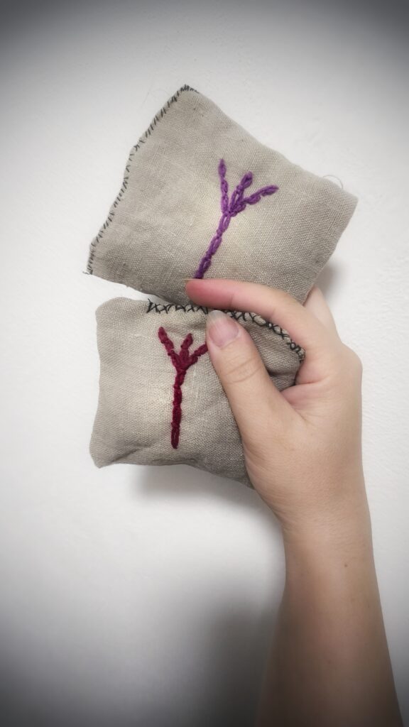 a pokud mohu, zjistím si růst dané byliny a jedu si ji nasbírat ručně. To vše je velmi časově náročné a vyžaduje znalosti jak magické, tak i zkušenosti s magickým sběrem bylin a samozřejmě komunikaci s místními duchy a bytostmi, abych si sběrem odnesla opravdu „energii v rostlině“ a ne nasrání duchů a suchou kytku. - Vlastní znak a bindruna: do každého škapulíře přidávám speciální runu, kterou vymýšlím Vám na míru a zakomponovávám do celého kouzla. Často se stane, že když už mám runu hotovou, tak se síla záměru změní a musím přizpůsobit celou dosavadní práci tak, aby si byliny a energie sedly. Škapulíř je živý organismus, bytost, kterou skládám od duše přes mysl po tělo, a je nutné pracovat s ní s citem. Po získání a vložení runy se mi objeví takový mozek celého škapulíře, který mi jemně ale rázně pomáhá určit další kroky.